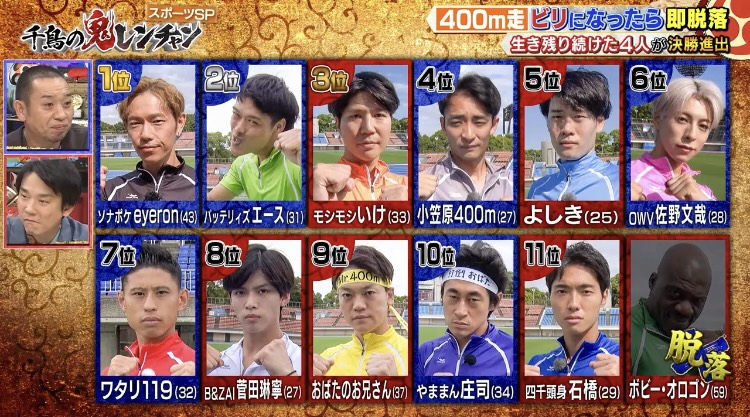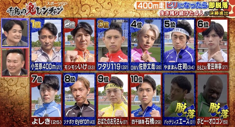 2025年11月23日(日)に「千鳥の鬼レンチャン」の放送で、【第7回400m走サバイバルレンチャン】が行われました。